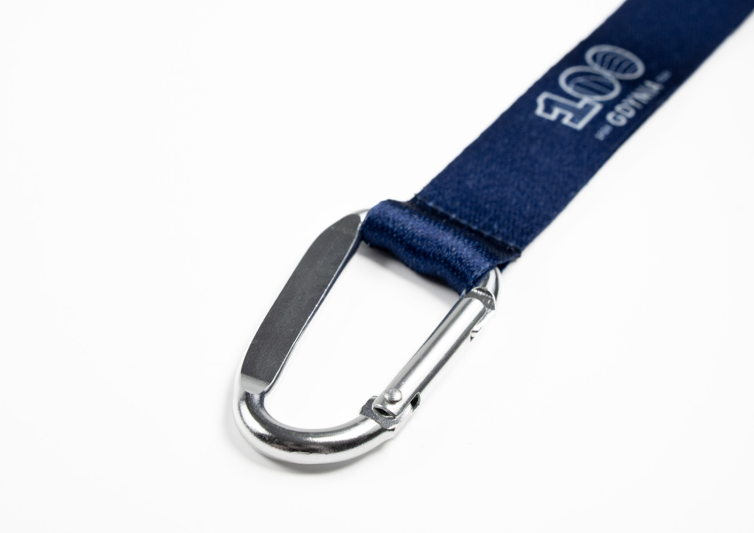 Granatowa krótka smycz-brelok z nadrukiem logo 100-lecia miasta Gdyni.