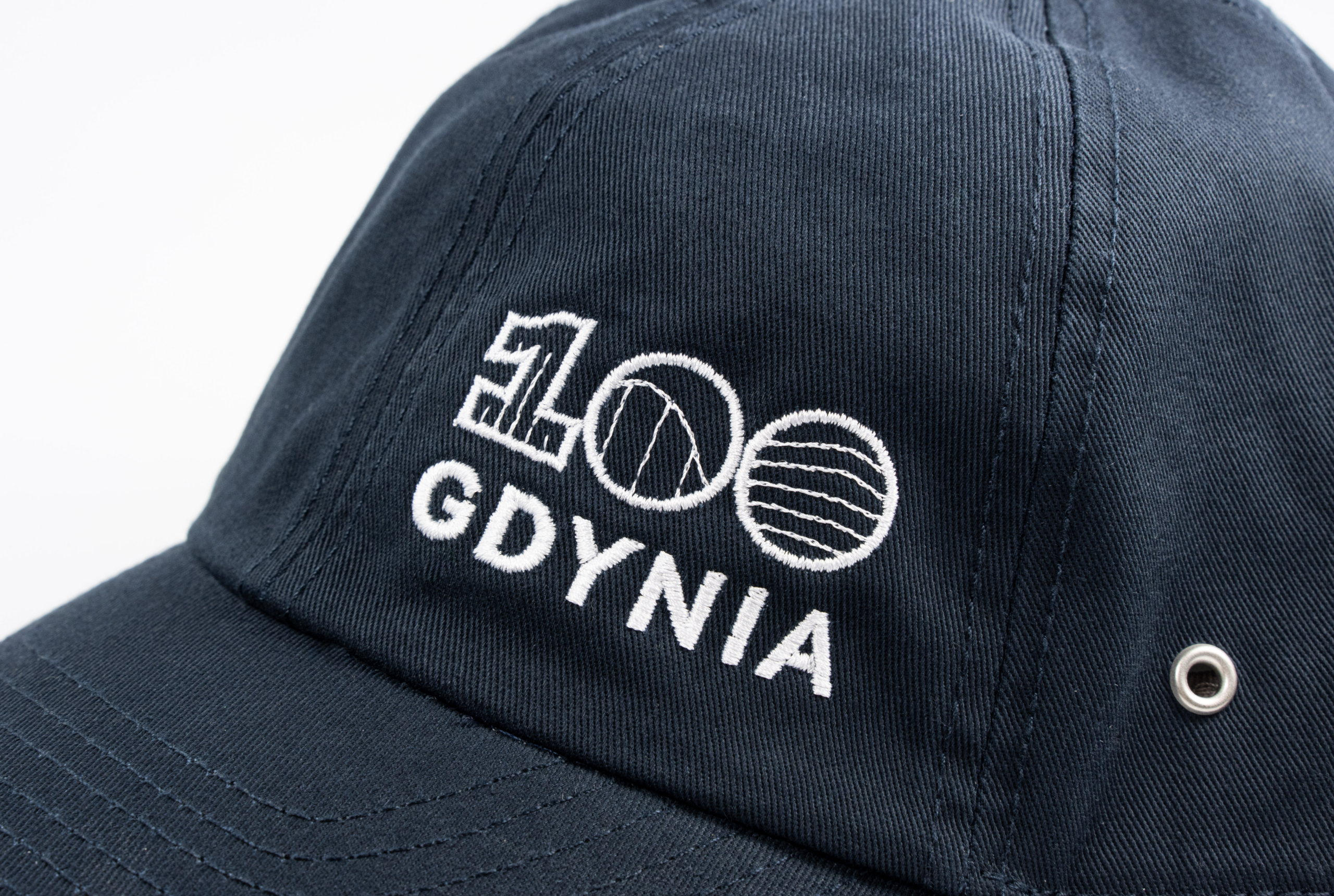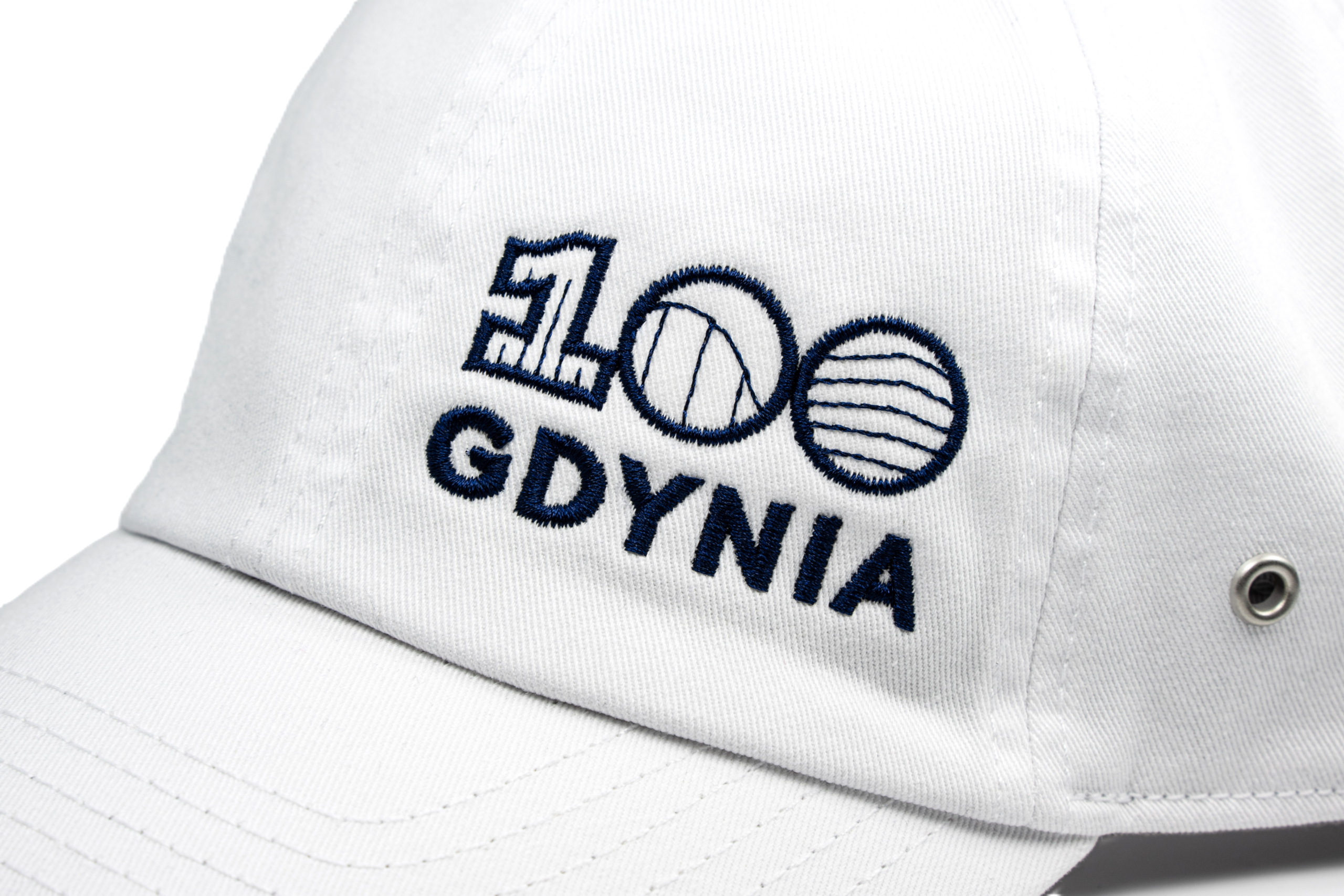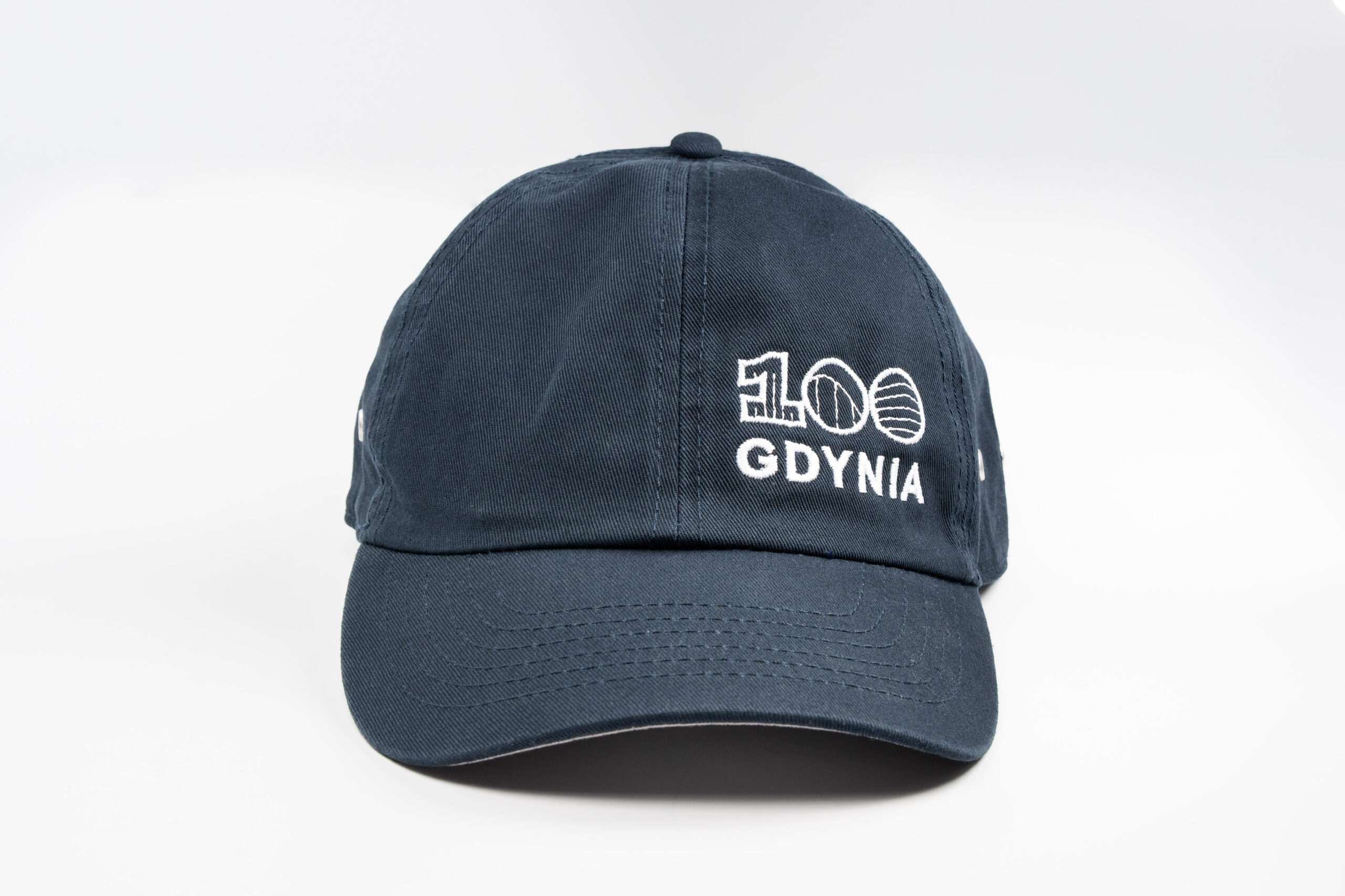 Czapka z daszkiem z wyhaftowanym logo 100-lecia miasta Gdyni. Dostępna w białym i granatowym kolorach.