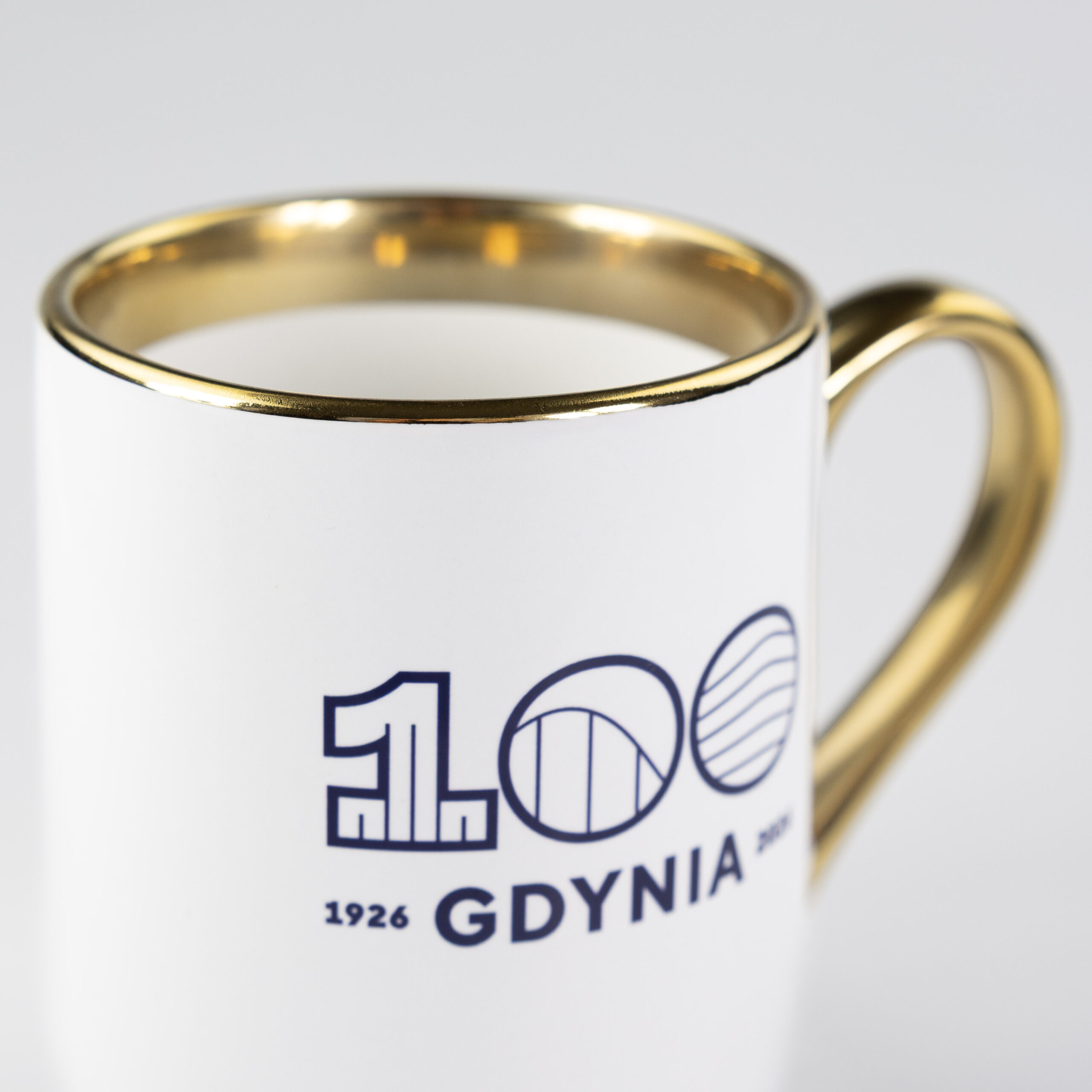 Elegancki kubek ze złotym rantem i uszkiem i nadrukowanym logo 100-lecia miasta Gdyni.