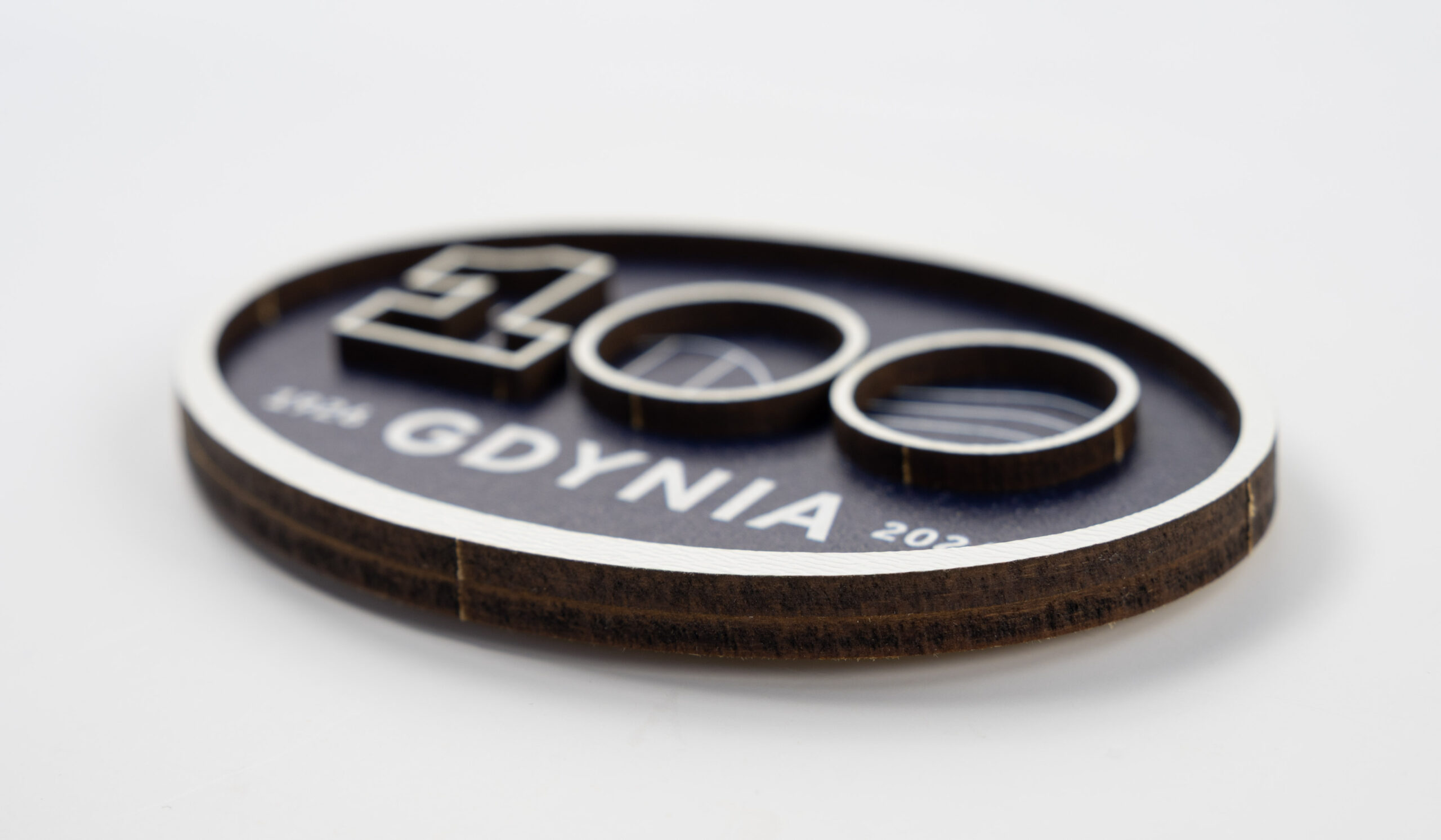 Magnes ze sklejki z dekoracjami 3D z logo 100-lecia miasta Gdyni.