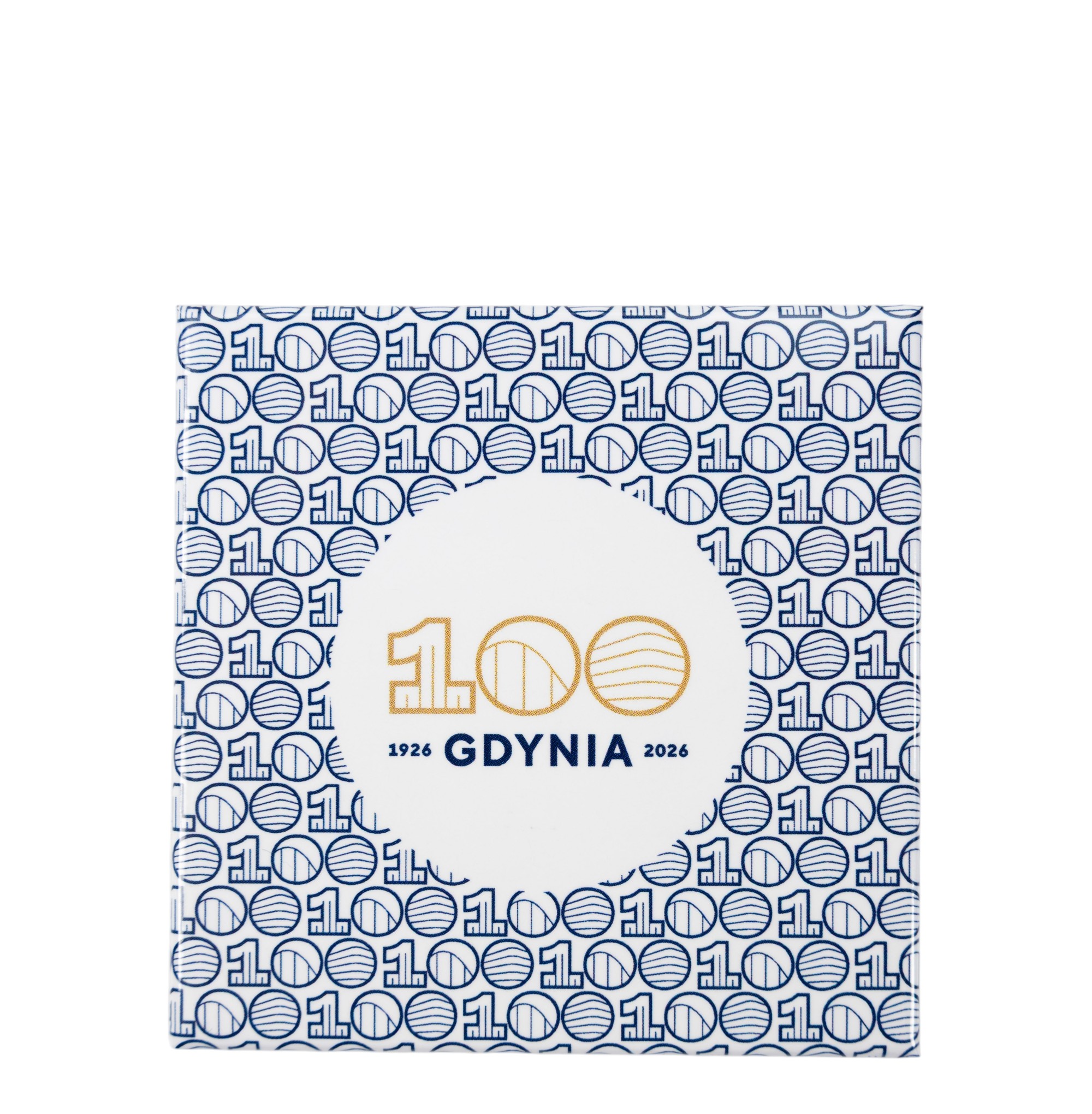 Magnes kwadratowy płaski z nadrukowanym logo 100-lecia miasta Gdyni.
