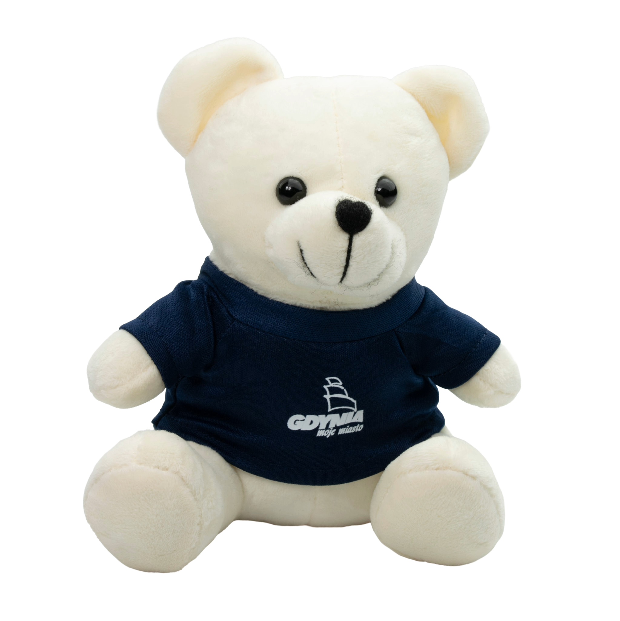Maskotka miś w granatowej koszulce z logo Gdyni. Miś wykonany z miękkiego materiału, przyjemny w dotyku, odpowiedni dla dzieci i dorosłych.