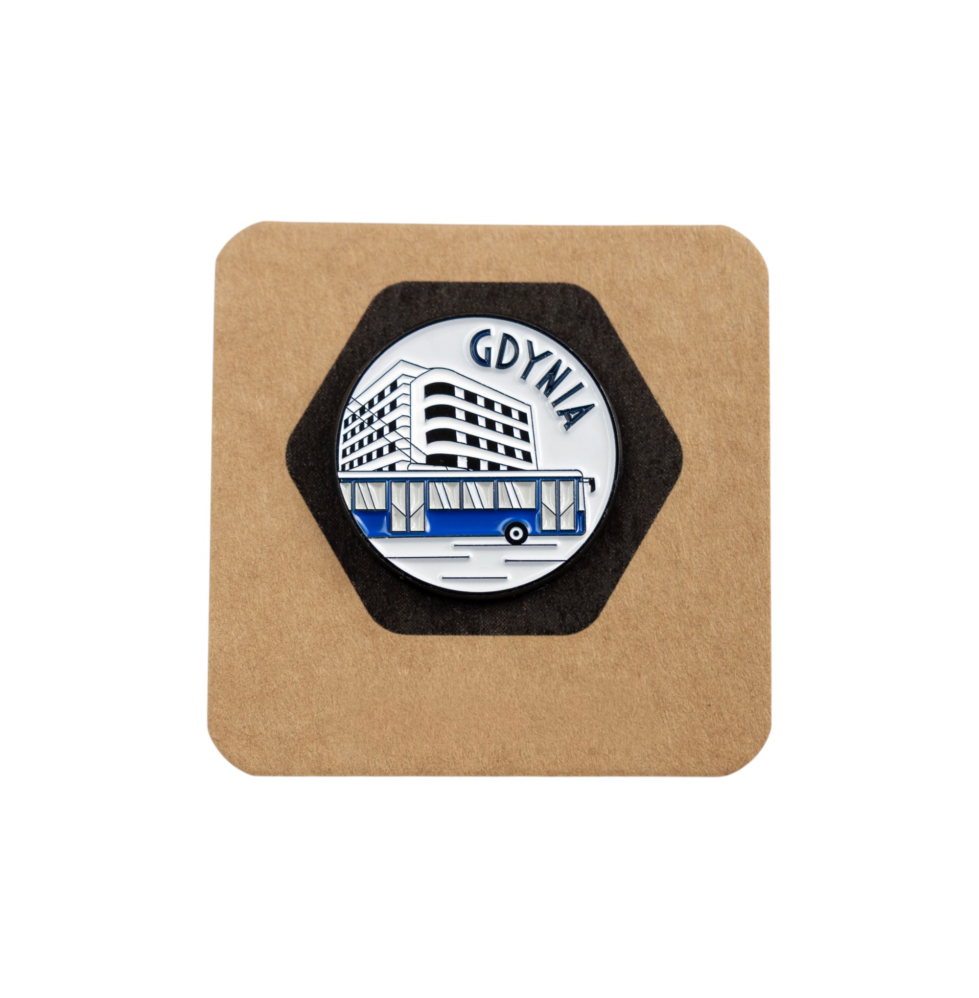 Pin przedstawia jeden z współczesnych trolejbusów charakterystycznych dla Gdyni z kamienicą Orłowskich w tle.