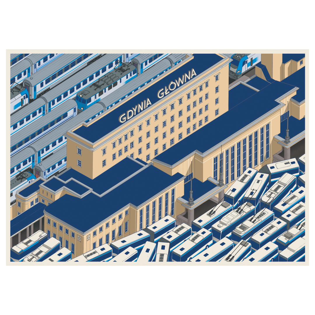 Plakat autorstwa gdyńskiego artysty Jana Rutki. Przedstawia dworzec główny miasta Gdyni.