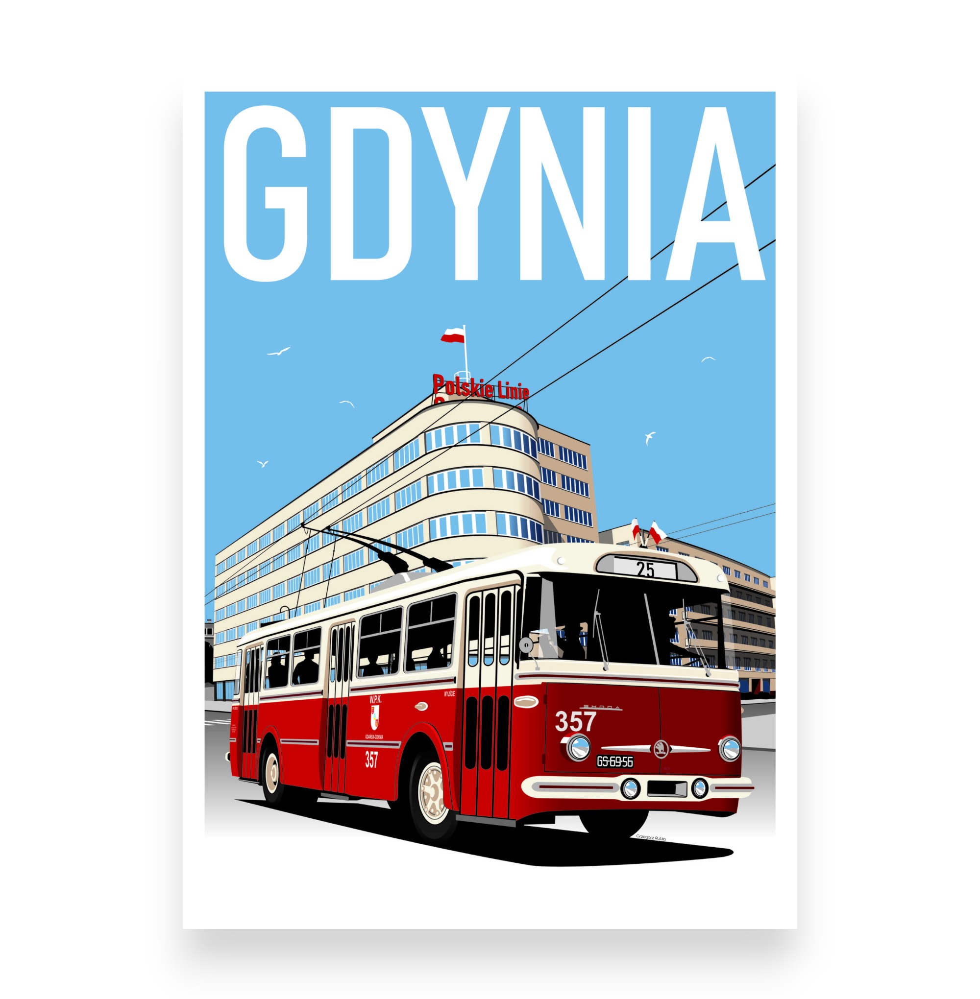 Plakat autorstwa gdyńskiego artysty Grzegorza Rutki. Przedstawia kultowy budynek PLO wraz z charakterystycznym retro trolejbusem Škoda.