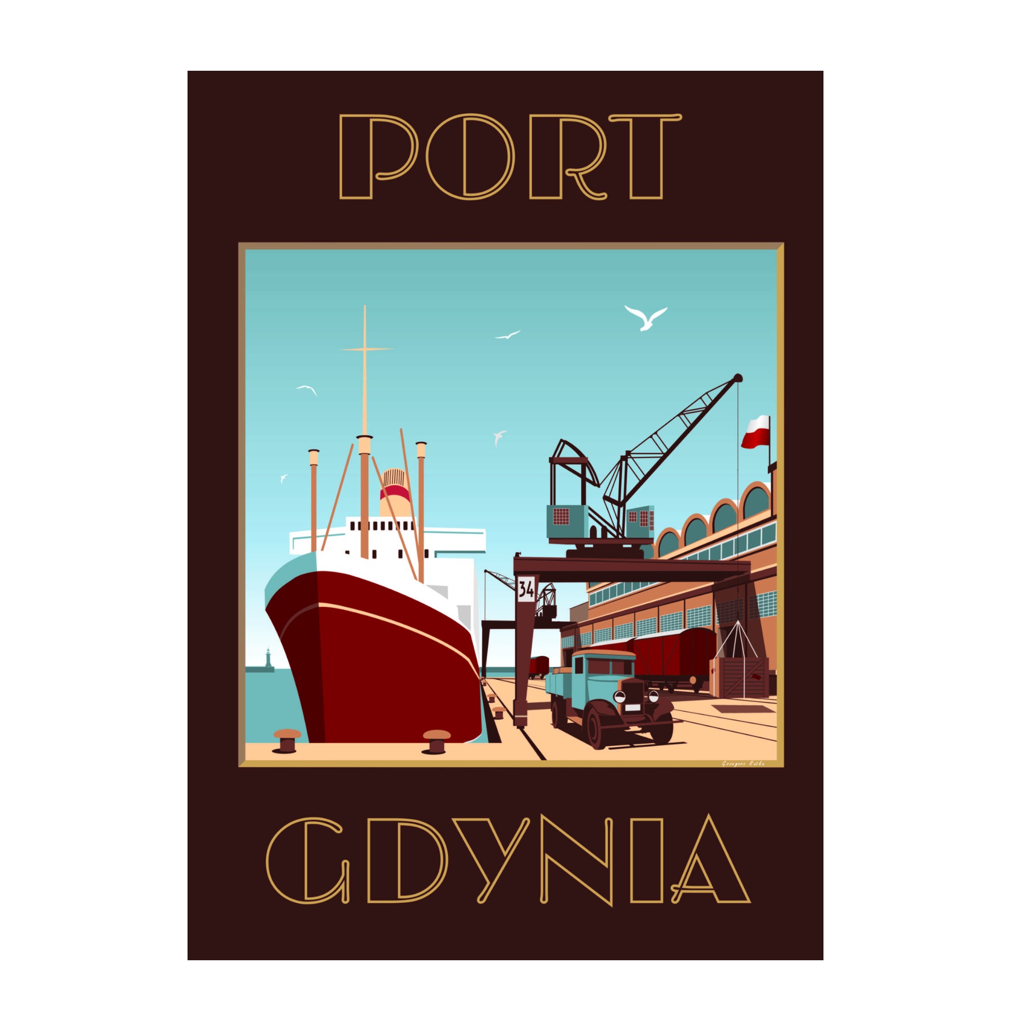 Plakat autorstwa gdyńskiego artysty Grzegorza Rutki. Przedstawia widok przycumowanego statku przy Dworcu Morskim, w którym obecnie mieści się Muzeum Emigracji.
