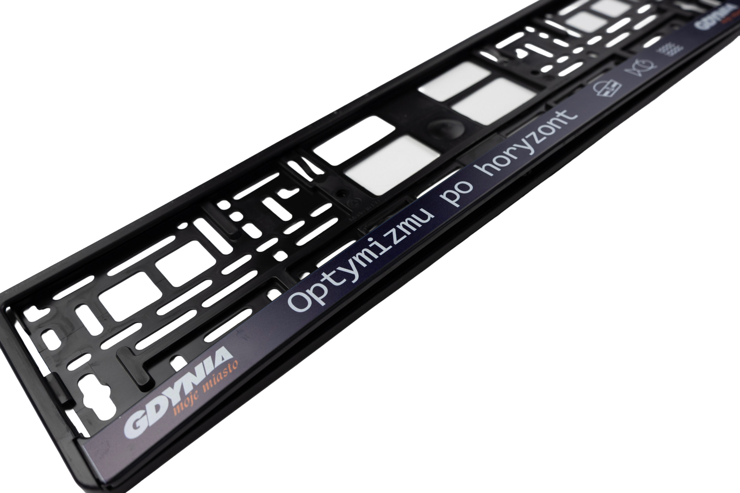Ozdobna ramka pod rejestrację samochodowa z napisem „Optymizm po horyzont”.