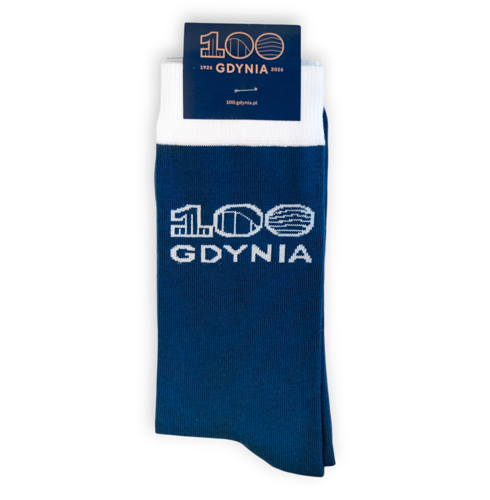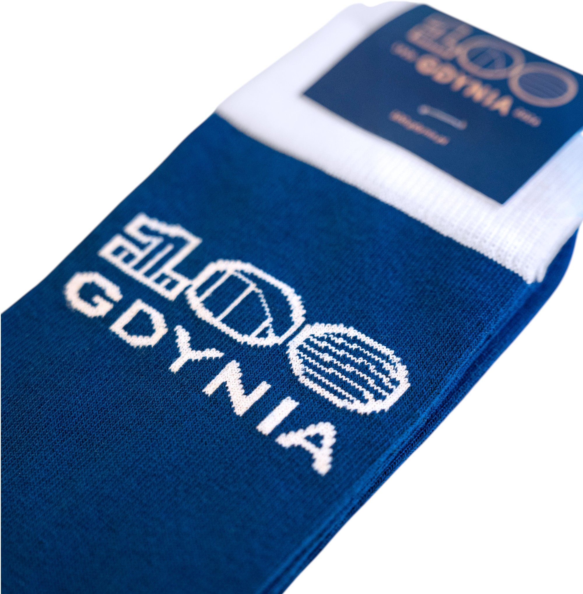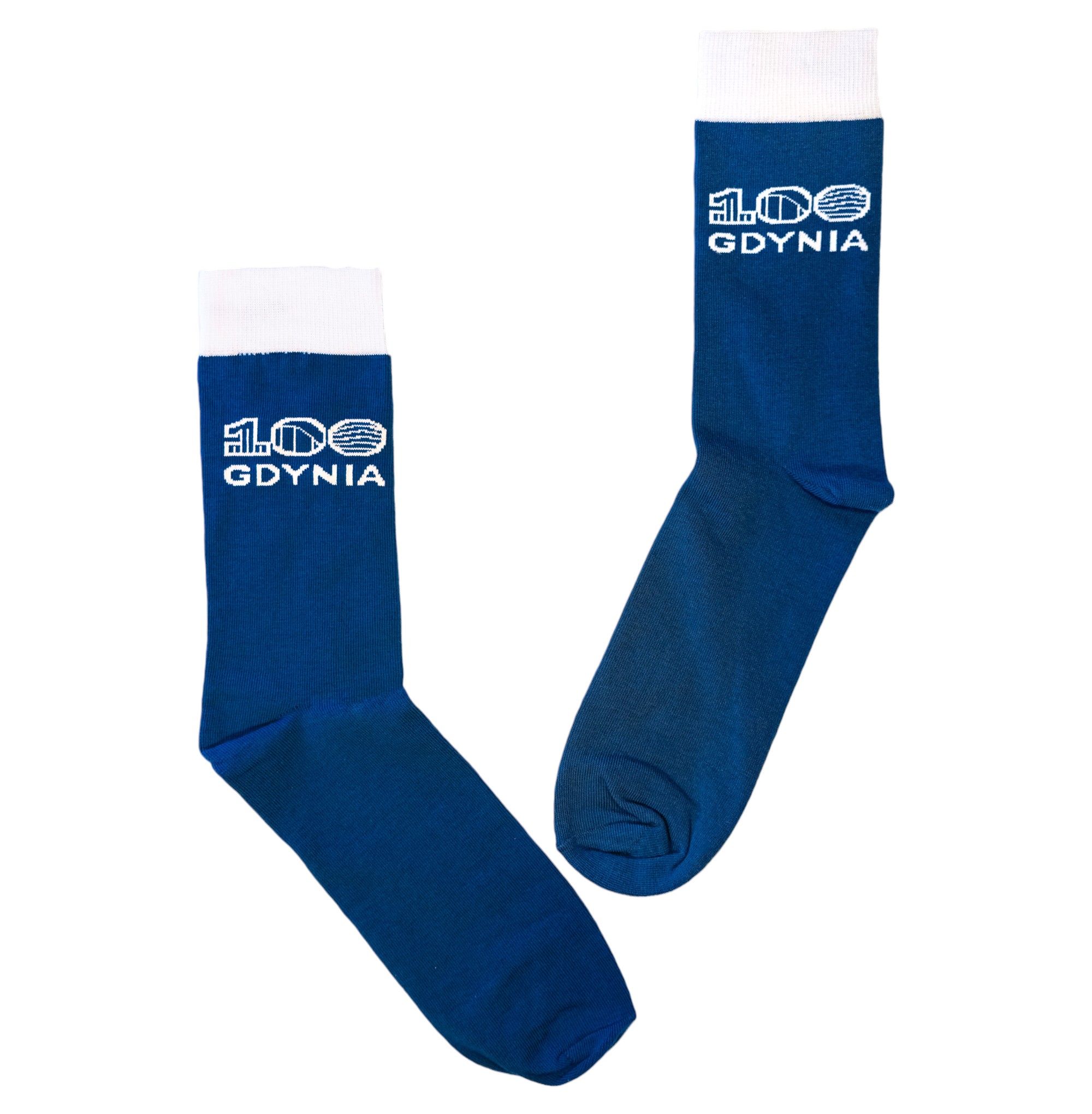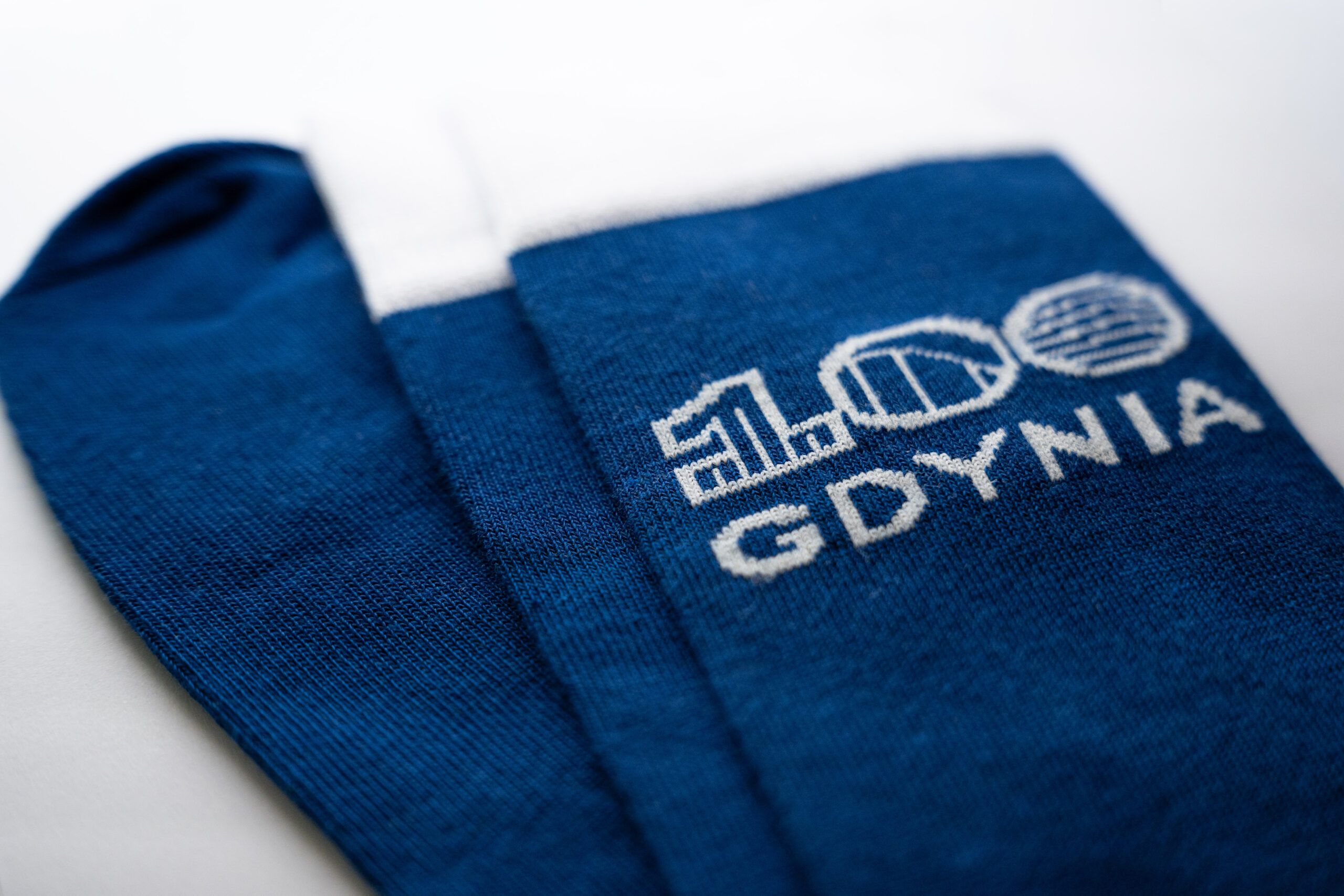 Minimalistyczne granatowe skarpetki z wyhaftowanym logo 100-lecia miasta Gdyni.