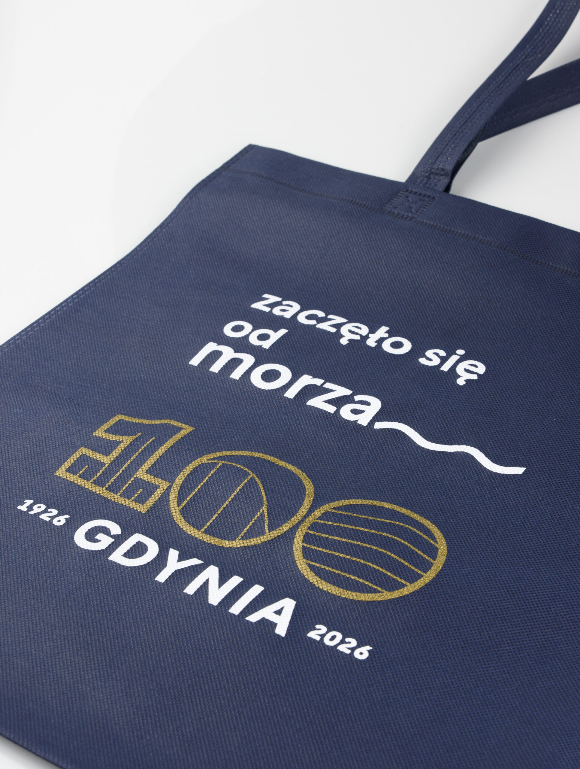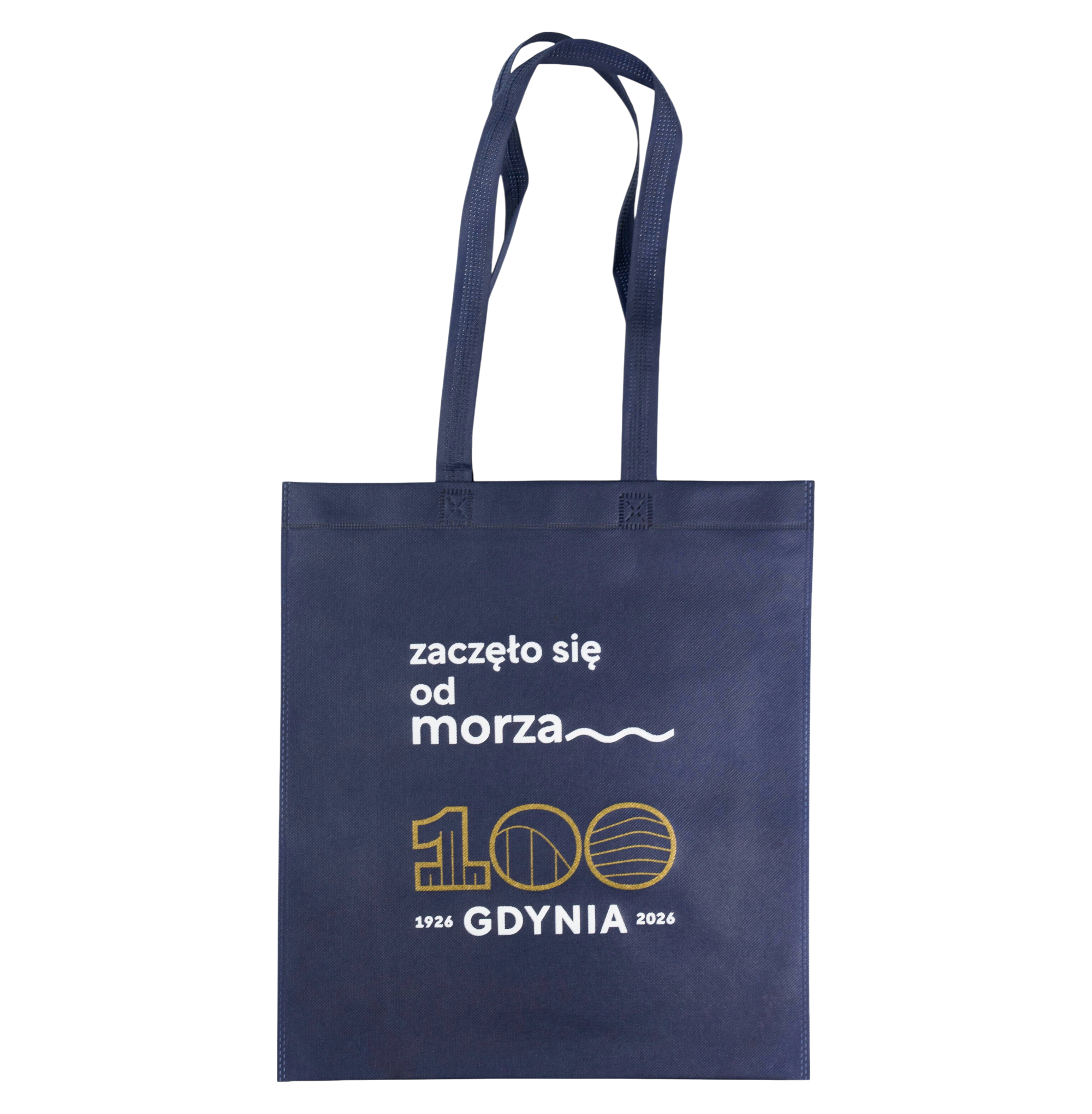 Ekologiczna torba z włókniny w granatowym kolorze z logo 100-lecia miasta Gdyni. Lekka, ma wygodne długie rączki.