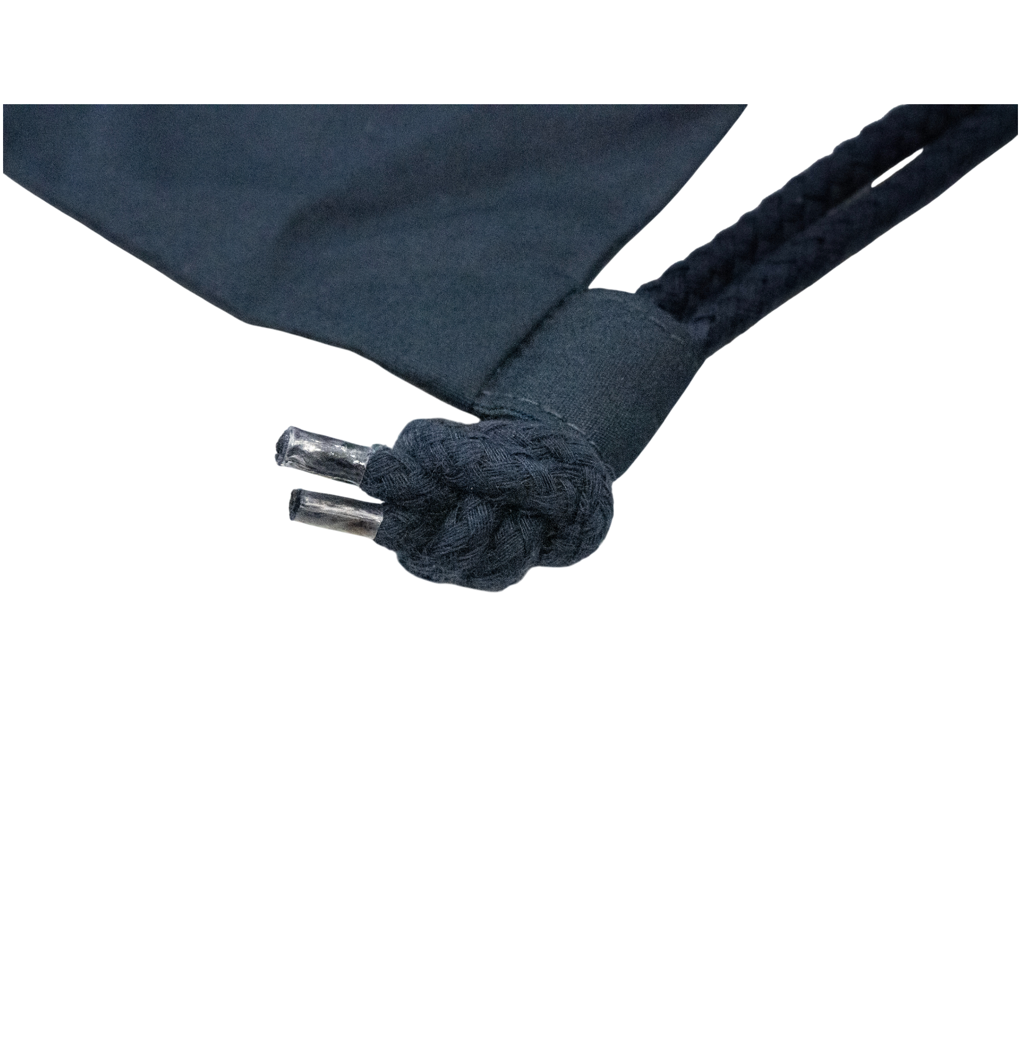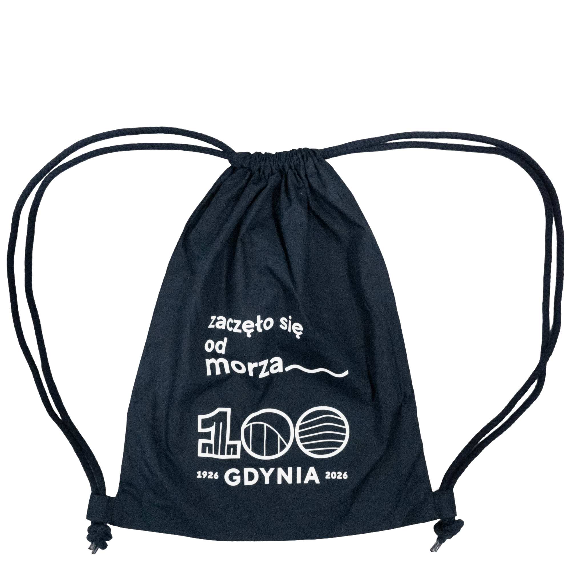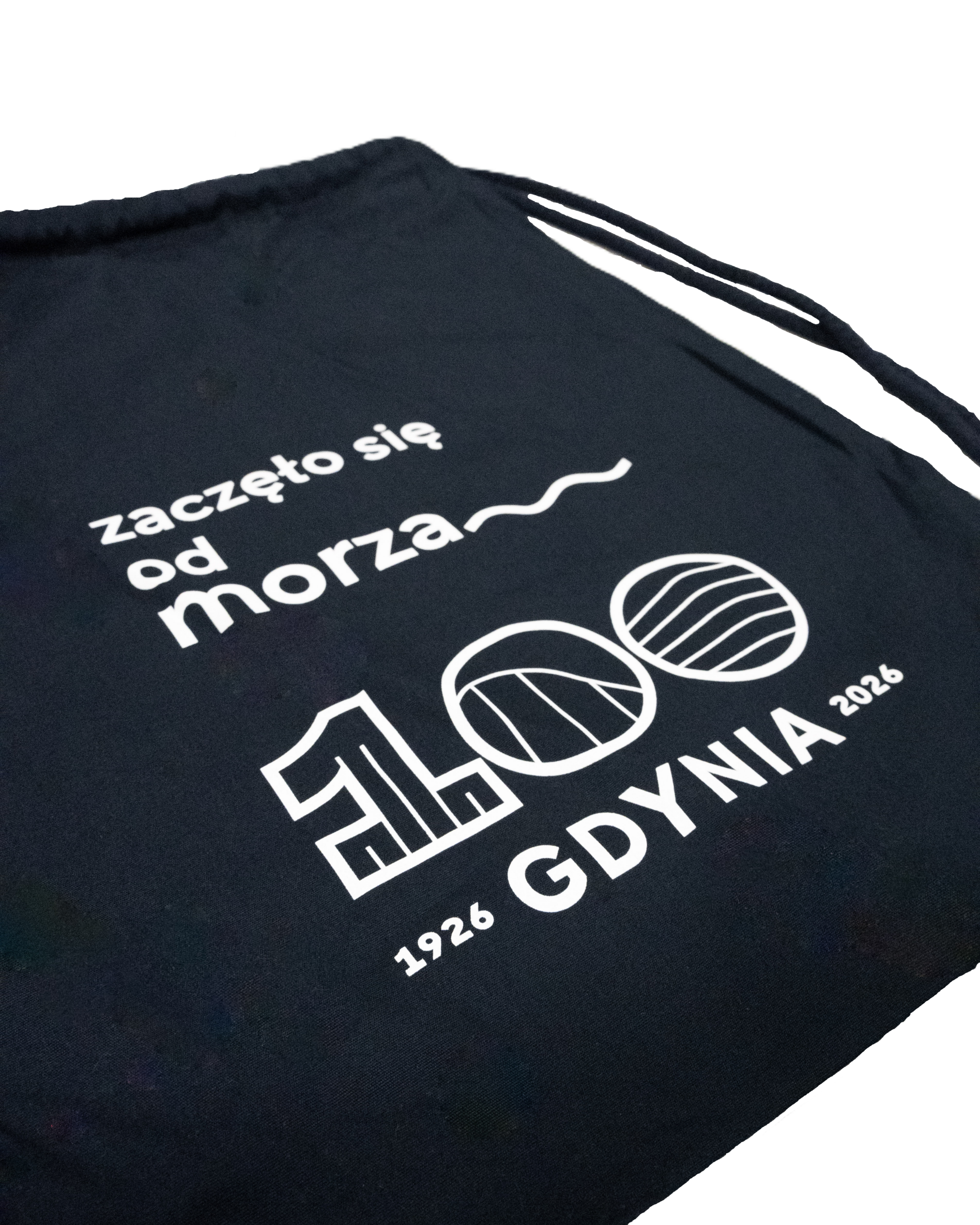 Bawełniany plecak-worek w kolorze granatowym z nadrukowanym logo 100-lecia miasta Gdyni.
