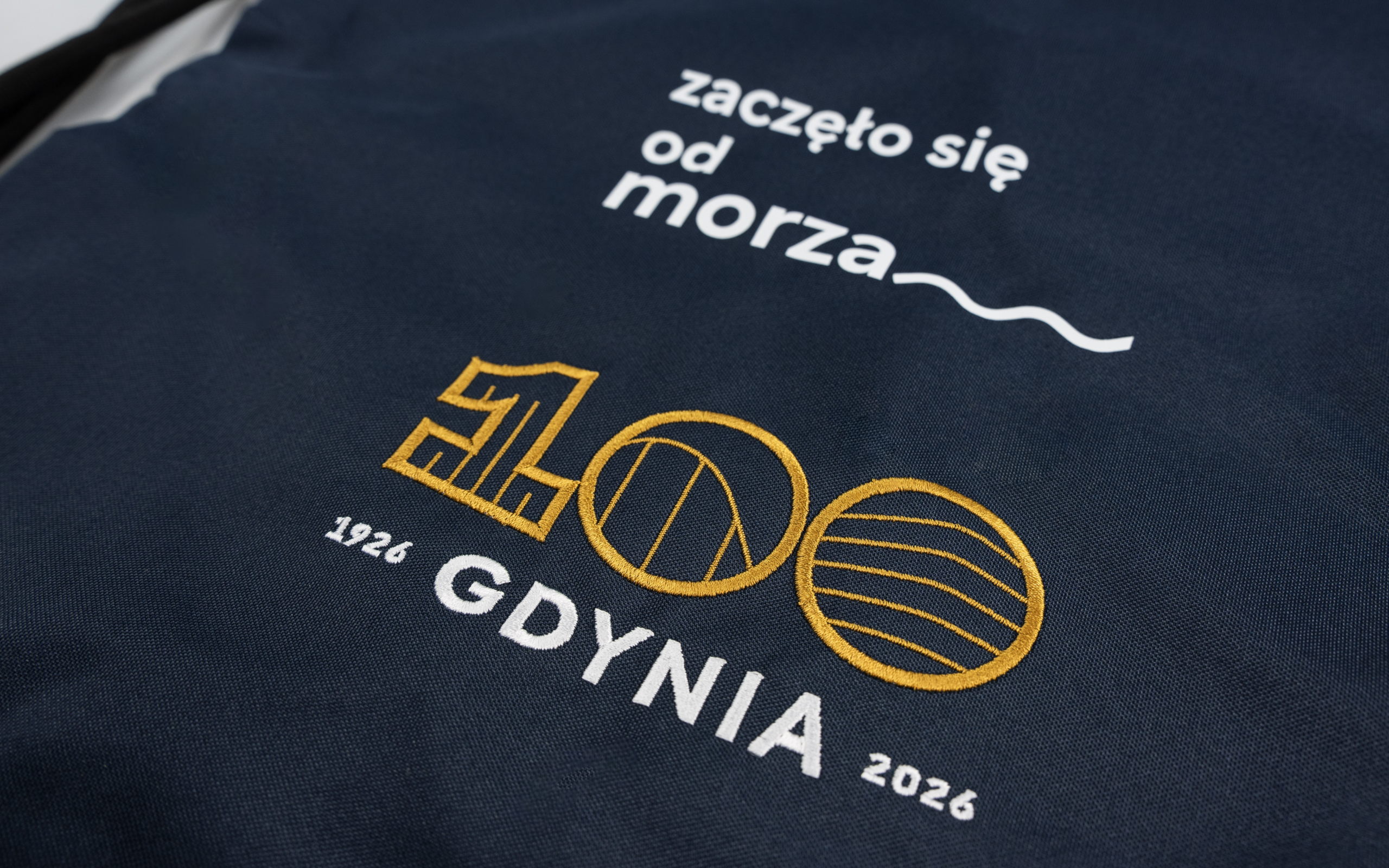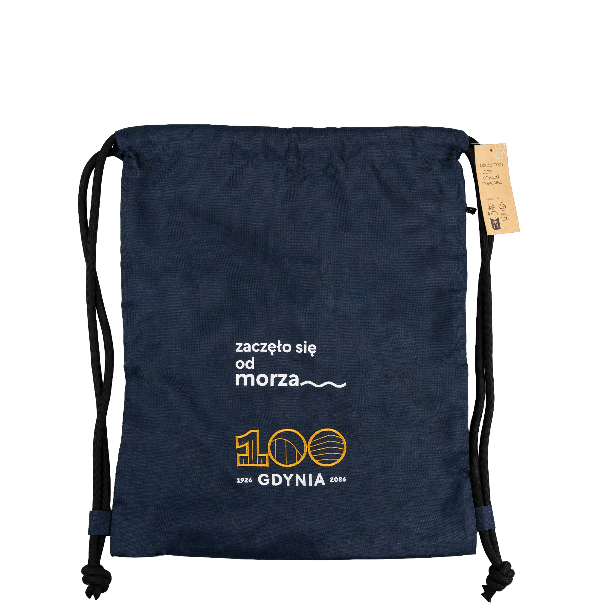 Worek z ukrytą kieszenią – schowkiem na zamek z wyhaftowanym logo 100-lecia miasta Gdyni.